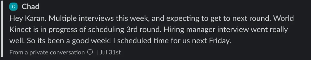 You will get weekly(on call) and daily(on slack) updates on to share successes and what we are doing on your job.